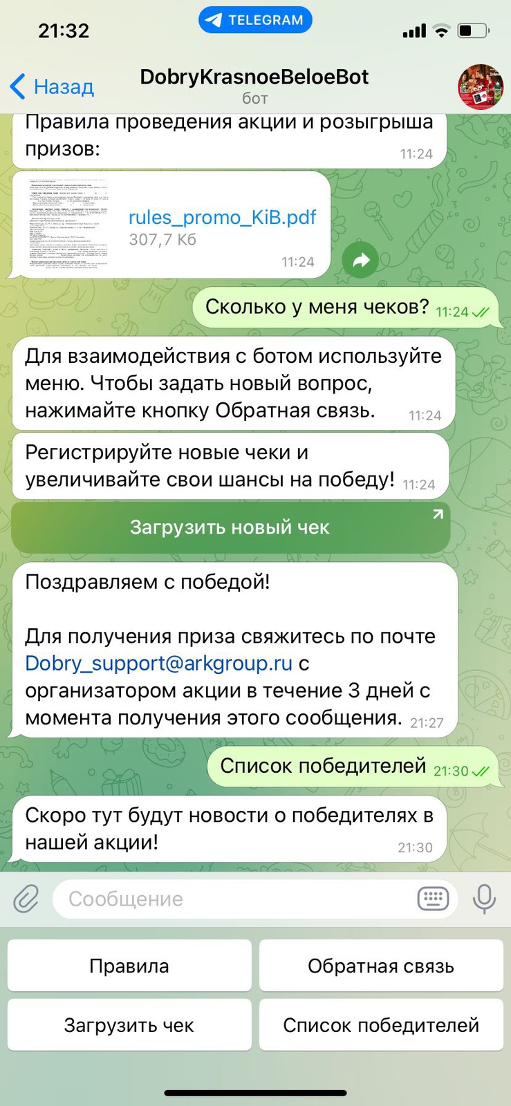- Регистрируй чеки в Телеграм-боте: @DobryKrasnoeBeloeBot