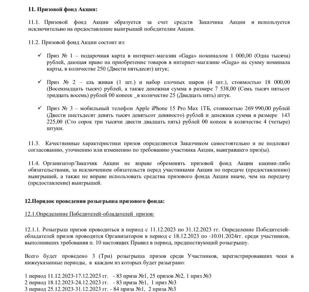 - Период совершения покупок и регистрации чеков с 11.12.2023 по 31.12.2023.