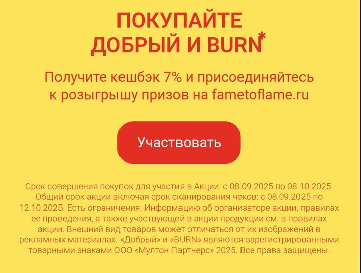 - Покупайте продукцию «Добрый» или «BURN» в магазинах «Пятёрочка»;