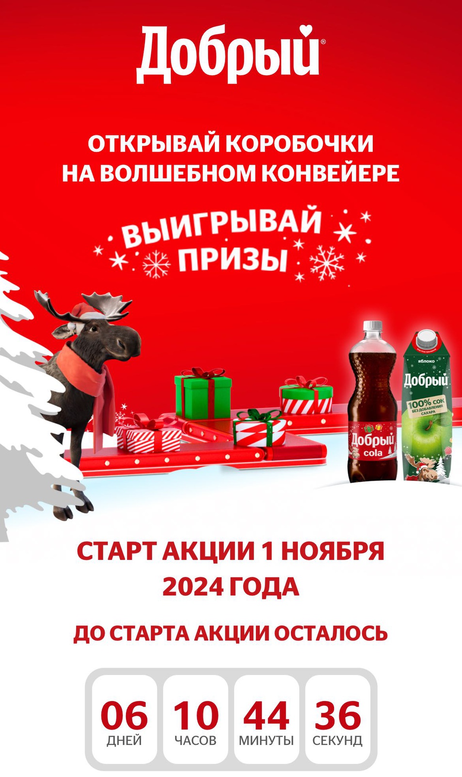 С 1 ноября 2024 года примите участие в новогоднем промо от напитков Добрый! Покупайте напитки Добрый в промо-упаковке, активируйте код из-под крышки и участвуйте в розыгрыше призов!