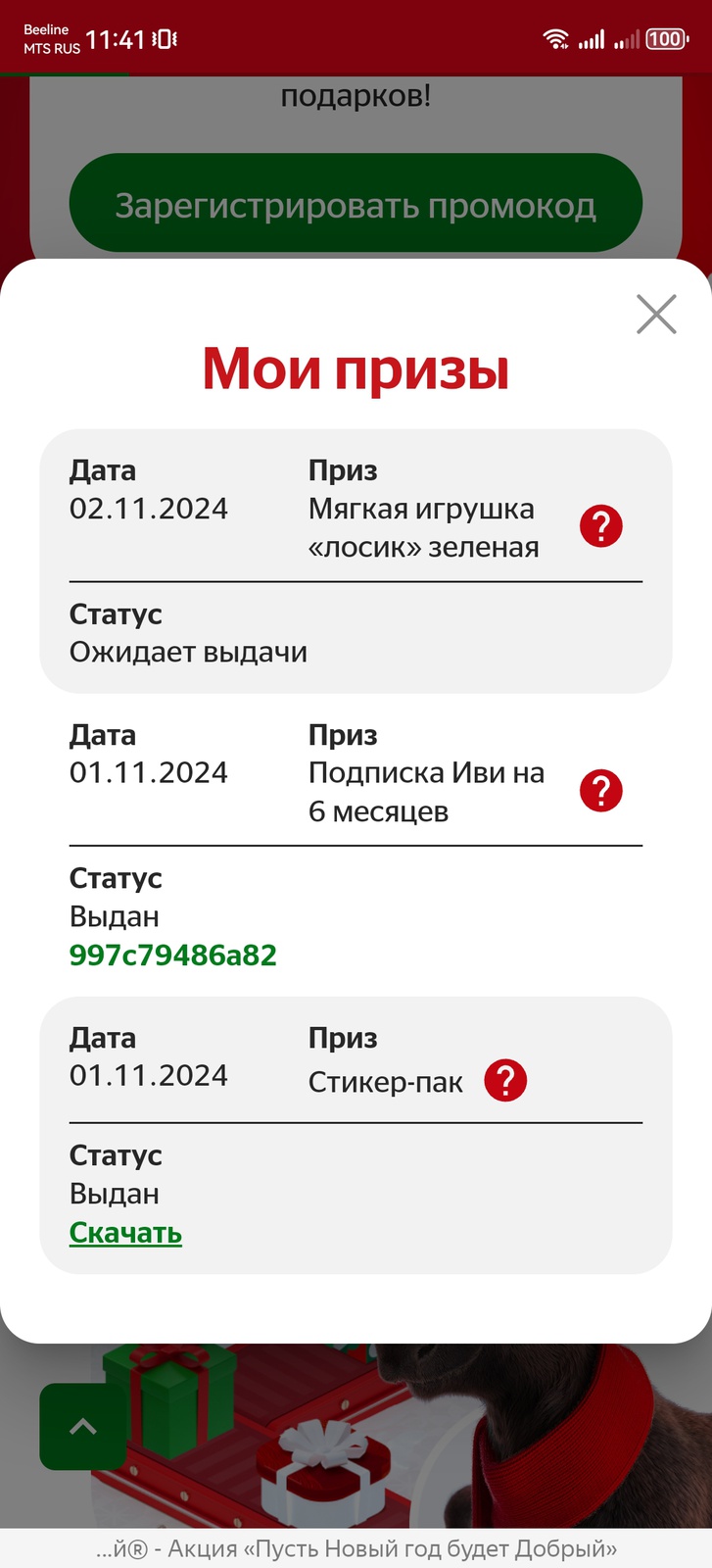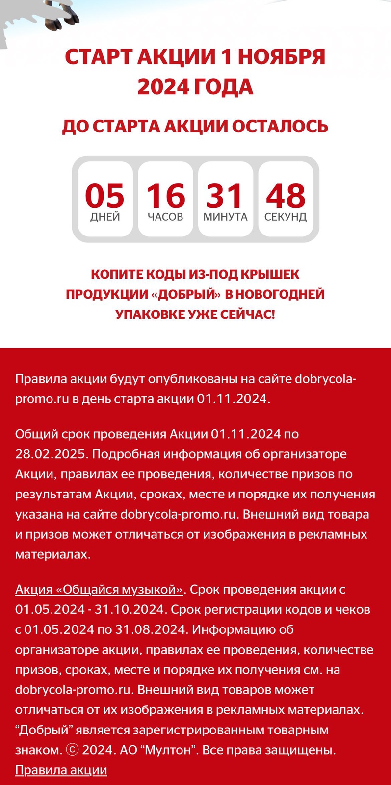 - Период покупки Товара и регистрации Кодов на Сайте: с 01 ноября 2024 г. 00:00:00 по 16 января 2025 г. 23:59:59.