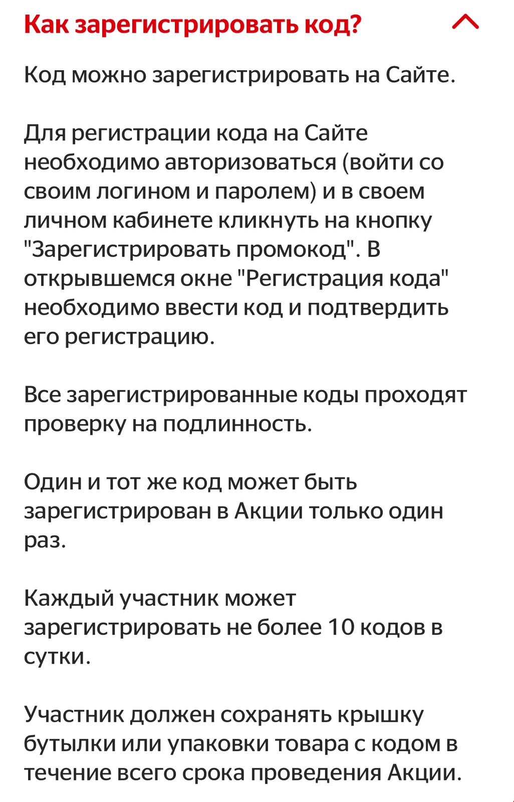 - Регистрируйте коды под крышкой/ключом на сайте акции;