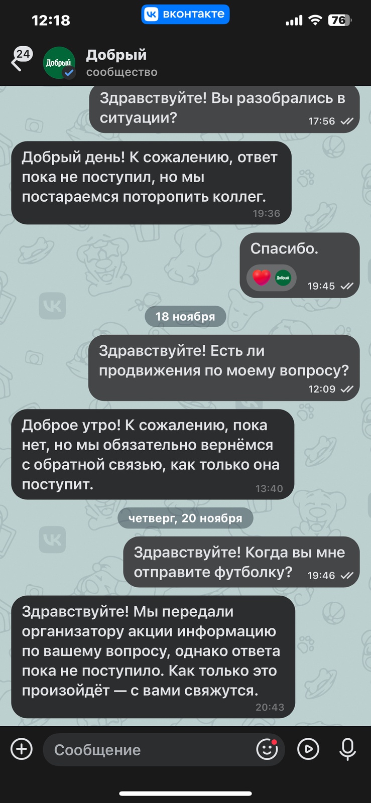 написала в тг @dobrycola_promo_bot, ответили "Мы будем писать туда же куда и вы и ждать ответ столько же. Они наши подрядчики и занимаются отправками. Вся информация у них. Ожидайте ответа, пожалуйста."