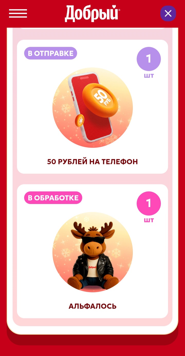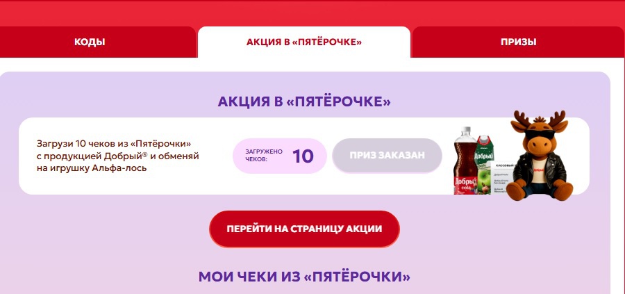 - Загрузите 10 чеков из «Пятёрочки» с продукцией Добрый® и обменяй их на уникальную игрушку лосика.