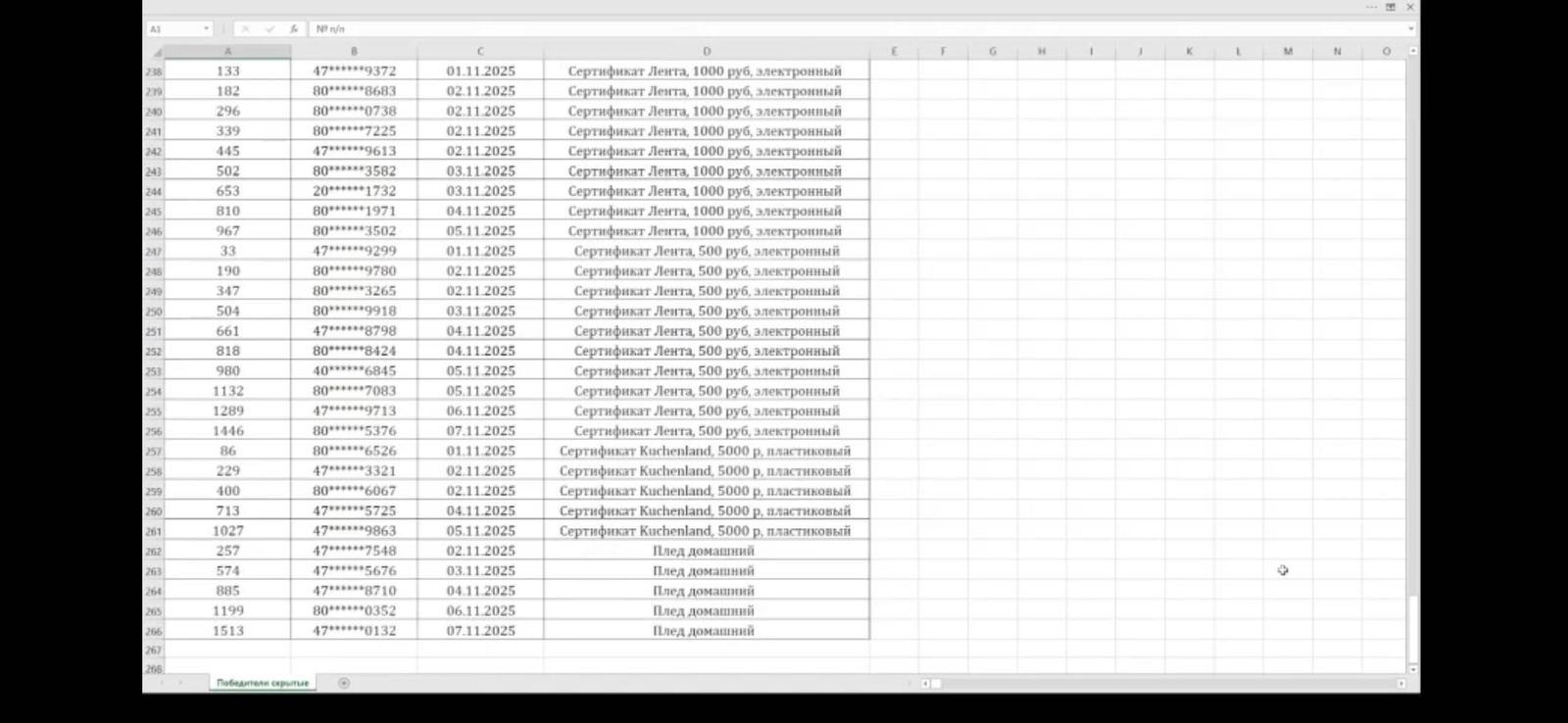 - Сертификат в магазин Лента на 2000 руб. – 100 шт.;