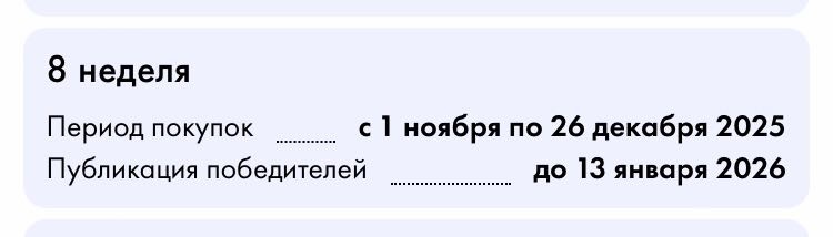 - Срок совершения покупок участников Акции для участия в Акции в период с 01 Ноября 2025 года с 00:01 часов по московскому времени по 11 Января 2026 года до 23:59 часов по московскому времени (включительно).