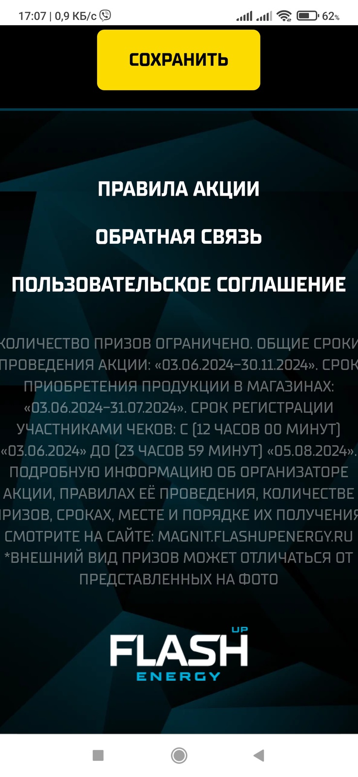 Покупайте продукцию Flash Up в магазинах «Магнит», регистрируйте чек, собирайте заряды и обменивайте на гарантированные призы или используйте для участия в еженедельном розыгрыше.