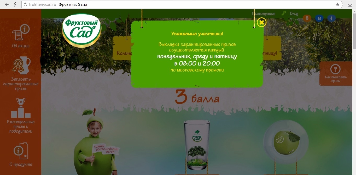 - Регистрируй коды со стикеров на сайте www.fruktoviysad.ru или через смс на 4441 и собирай коллекцию гарантированных призов!
