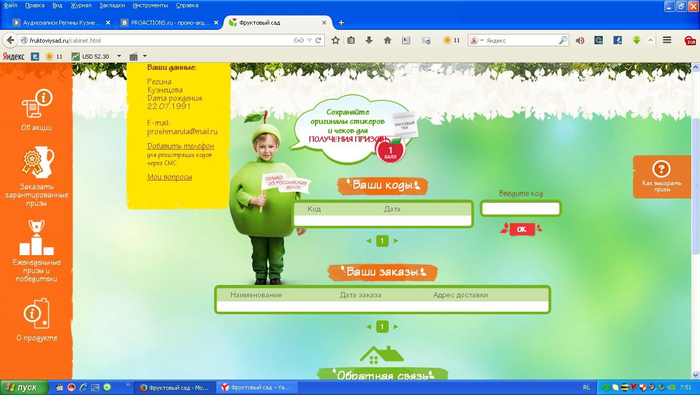 - Регистрируй коды со стикеров на сайте www.fruktoviysad.ru или через смс на 4441 и собирай коллекцию гарантированных призов!