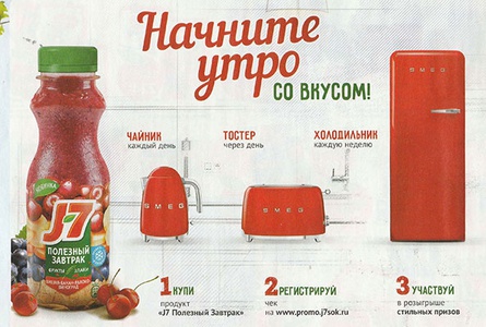 С 11 апреля 2019 года участвуй в акции от J7. Покупай продукцию "J7 Полезный завтрак" в сети магазинов "Пятерочка", регистрируй чеки, участвуй в розыгрыше призов!