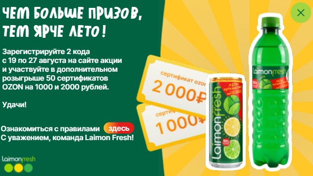 Покупайте продукцию Laimon Fresh в промо-упаковке, найдите уникальный код под крышкой или ключом, регистрируйте код на сайте акции и участвуйте в розыгрыше призов.