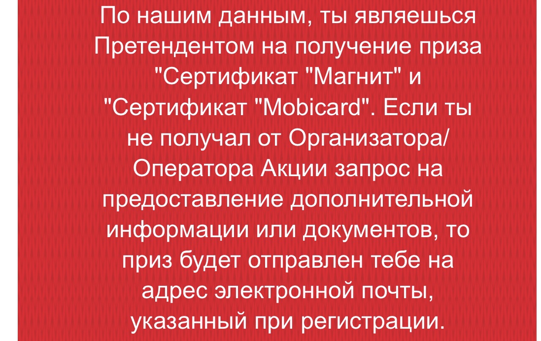 - Зарегистрируй мин 3 чека - участвуй в розыгрыше еженедельного приза Mobicard (1 000 рублей);