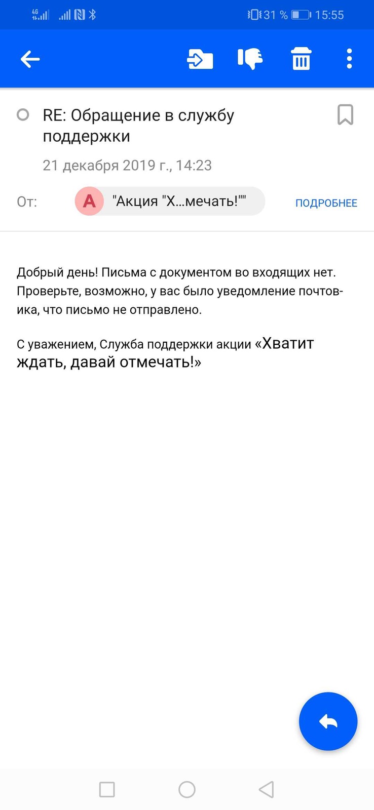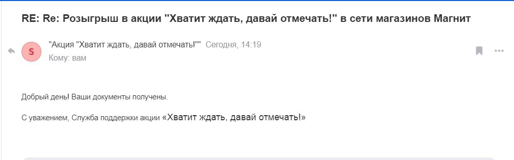 С уважением, Служба поддержки акции «Хватит ждать, давай отмечать!»