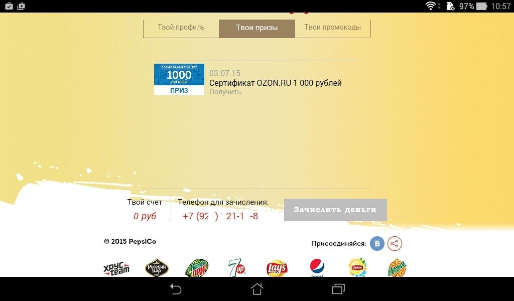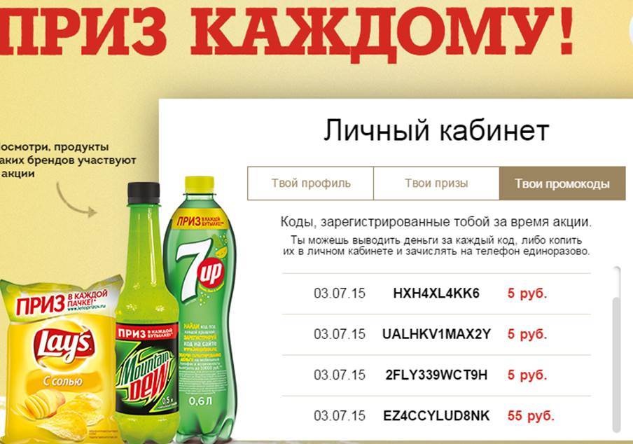 C 1 июня 2015 года участвуйте в акции от PepsiCo! Ищите коды под крышками напитков Pepsi, 7up, Mirinda, Mountain Dew, кваса Русский дар, внутри пачек чипсов Lay's, сухариков Хрусteam, регистрируй коды на сайте акции и выигрывай призы!