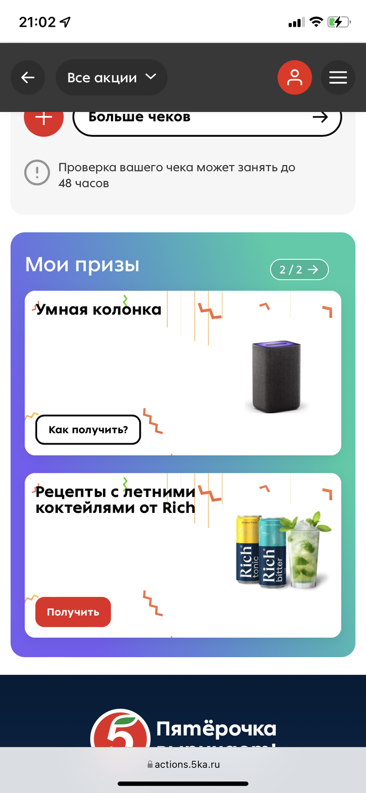В подобных акциях Пятерочки такая ситуация не в новинку. К сожалению, никак не решалась, приходилось просто ждать пока проверят. ((