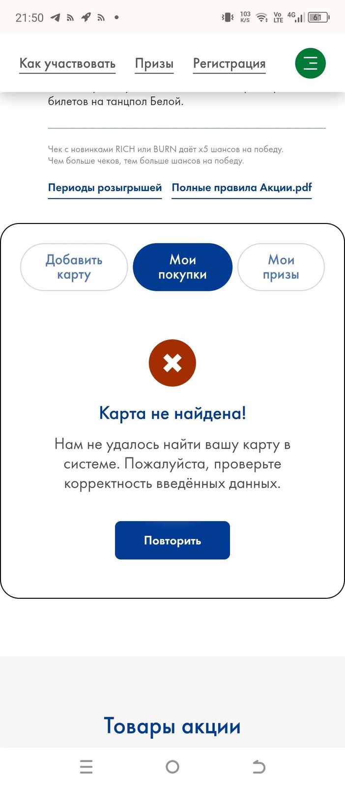 Регистрируйте Карту № 1 на сайте акции. Для участия в розыгрыше совершите покупку от 1 шт. напитка под брендами RICH и/или BURN с 15 июля по 30 сентября 2025 года в любых магазинах «Лента» или с доставкой с обязательным применением Карты № 1. Получайте гарантированные призы, шанс на победу в розыгрыше стильных призов и выигрывайте VIP-тур на Белую. Пробуйте новинки RICH или BURN и получайте х5 шансов на выигрыш за 1 чек с новинкой. Накопите от 6 покупок любых напитков RICH или BURN и участвуйте в дополнительном розыгрыше билетов на танцпол Белой.