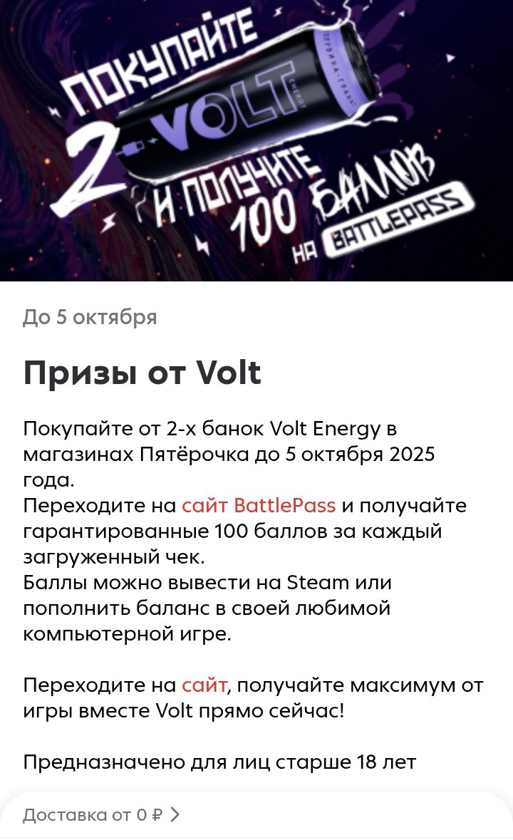 - Покупайте от 2-х банок Volt Energy в магазинах Пятёрочка до 5 октября 2025 года;