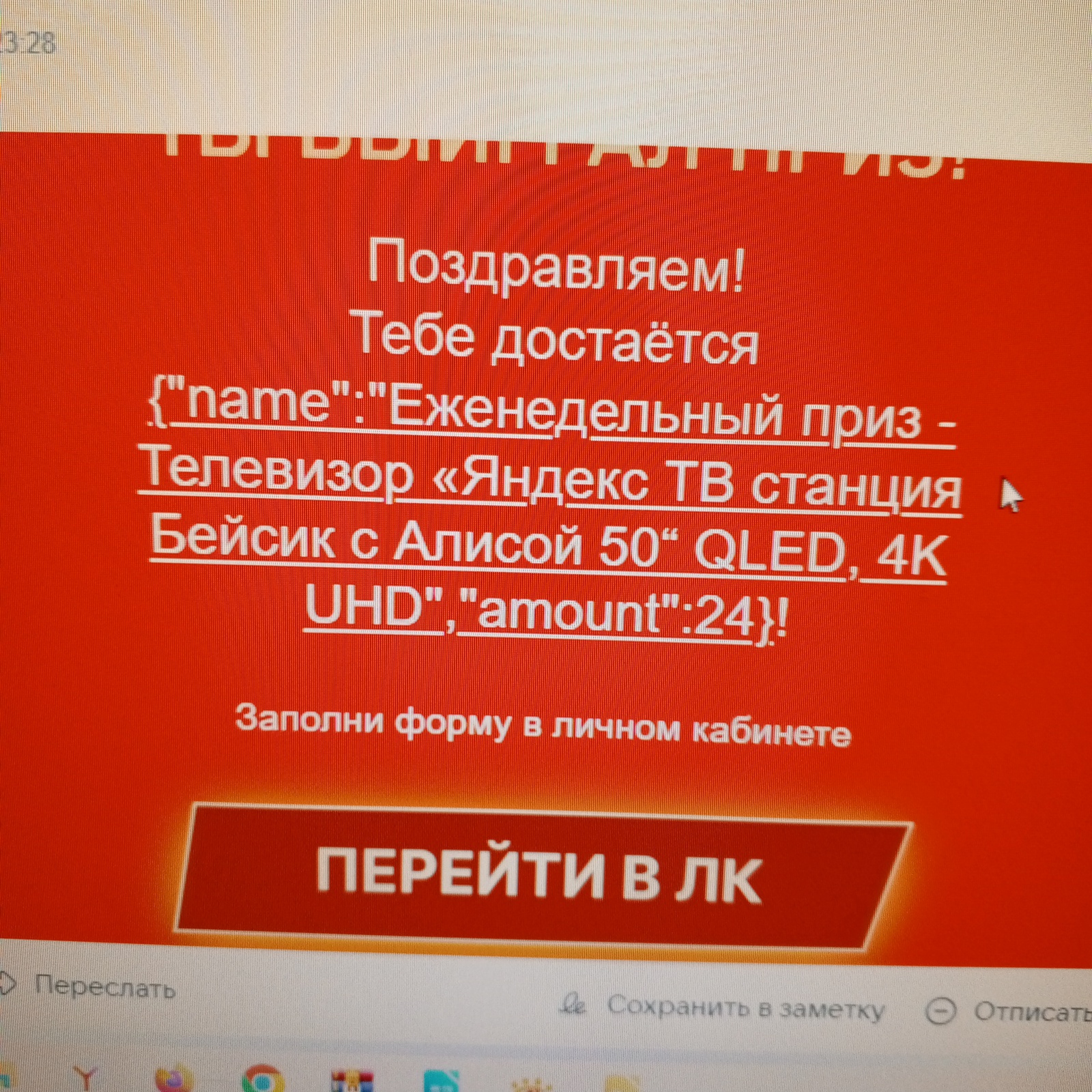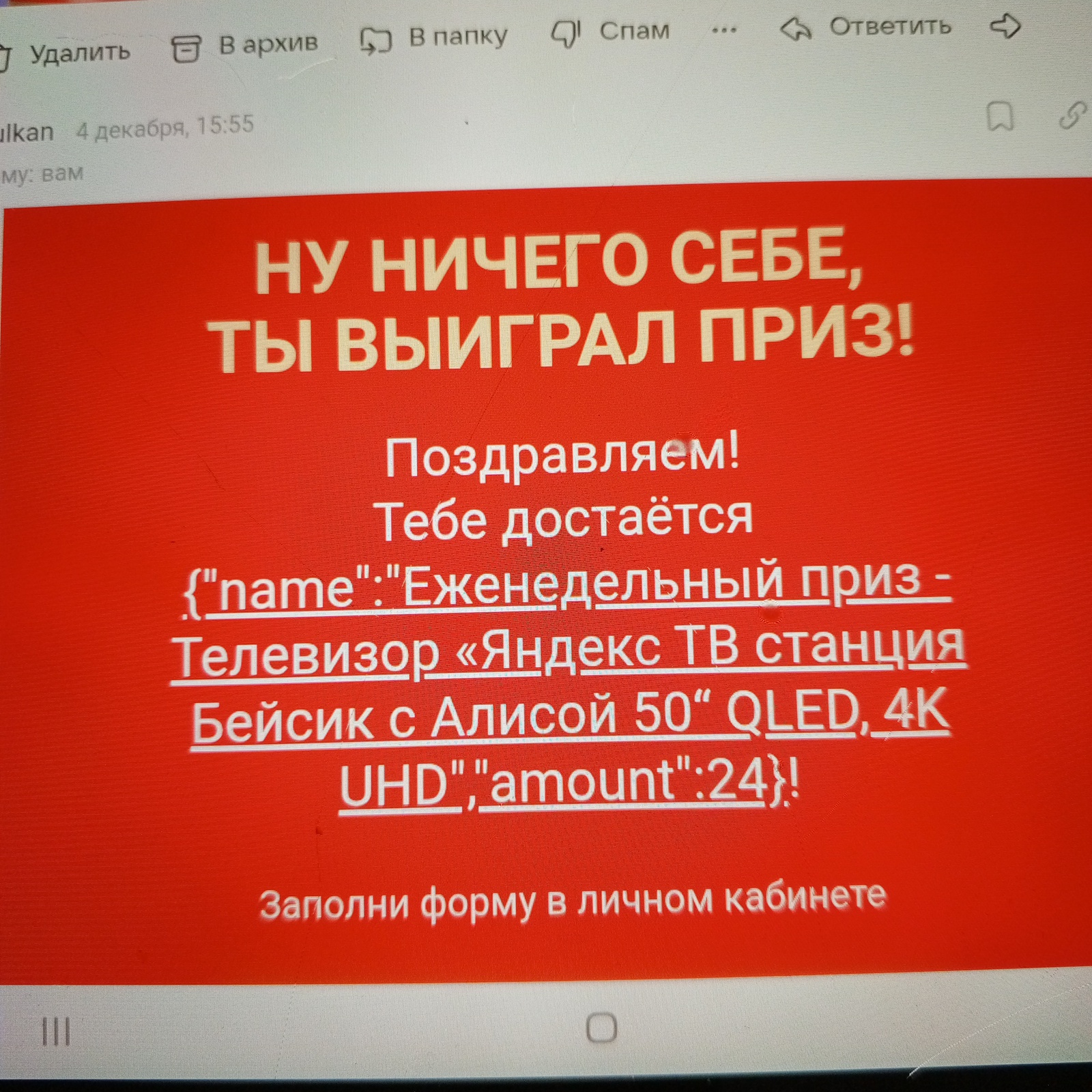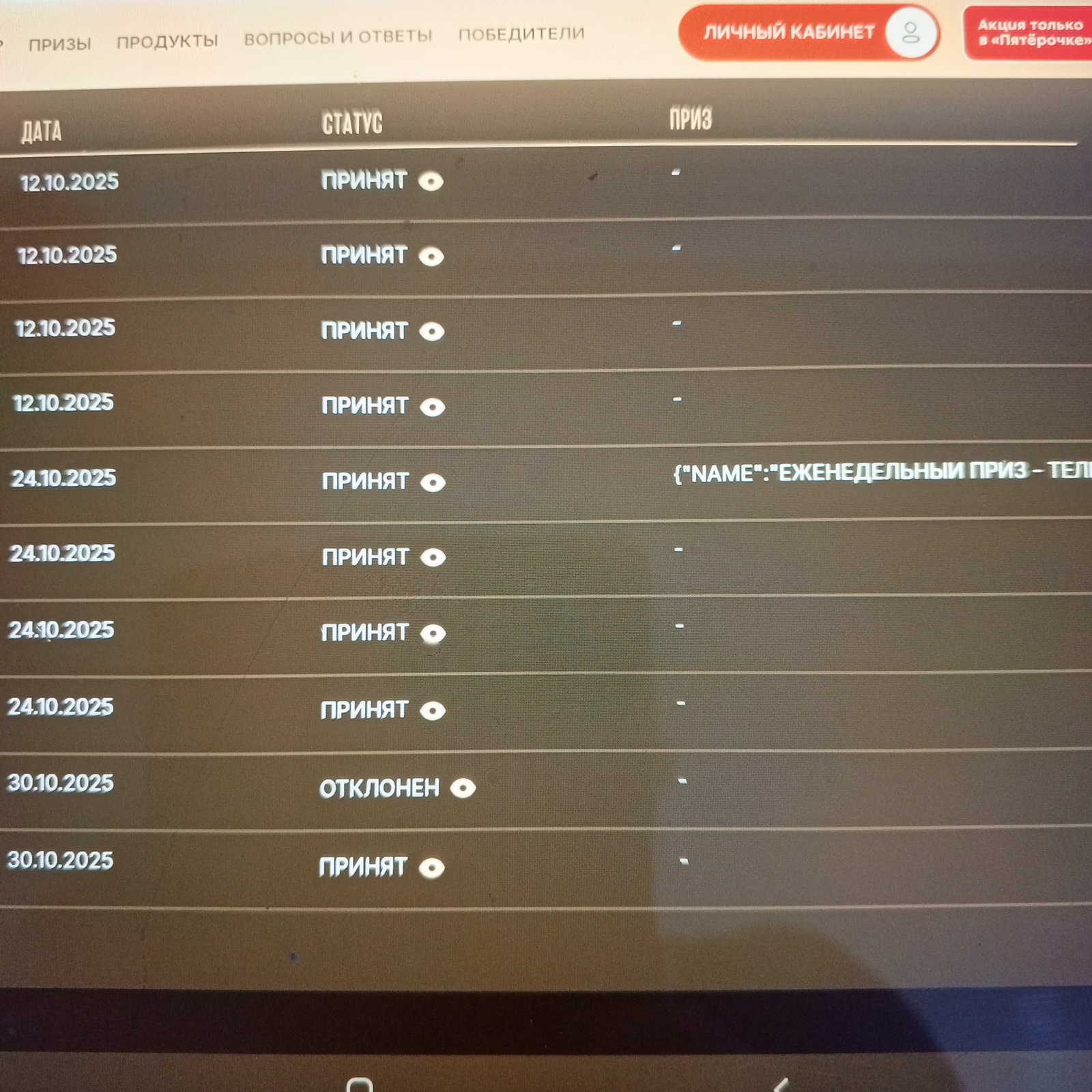 Сегодня звонит сестра зашла в личный кабинет а приза нет ,и исчез из списка победителей на сайте, она выиграла телик и разрешила выложить скрин , живем в одном подьезде и чеки вместе регили она на себя я на себя жена на себя ,товарищи организаторы как то вы не серьезно решили пошутить но я сестре сказал иди в суд я даже денег тебе дам на адвоката что бы показать что вы мошонки (мошенники) все письма и скрины у меня есть терять мне и ей как она сказала нечего , просто надо показать всем что вы ребята не честные кому хочу дам кому хочу не дам , даже если это ошибочно то пусть отвечает тот человек который прислал письмо с выигрышем телика и запрсил данные паспорта и инн , вы бренд и как я понимаю команда поэтому надо отвечать за свои действия , для вас это копейки даже если это ошибка, а репутацию я вам подпорчу , я продукцию всю покупал и сестра все чеки сложила они в наличии 5а суде как раз пригодяться , сестра написала вам письмо ,ждем развитие событий , ща еще попрошу здесь помощи куда и как накатать на вас письмо за ваши действия ,скрин исчезновения телика