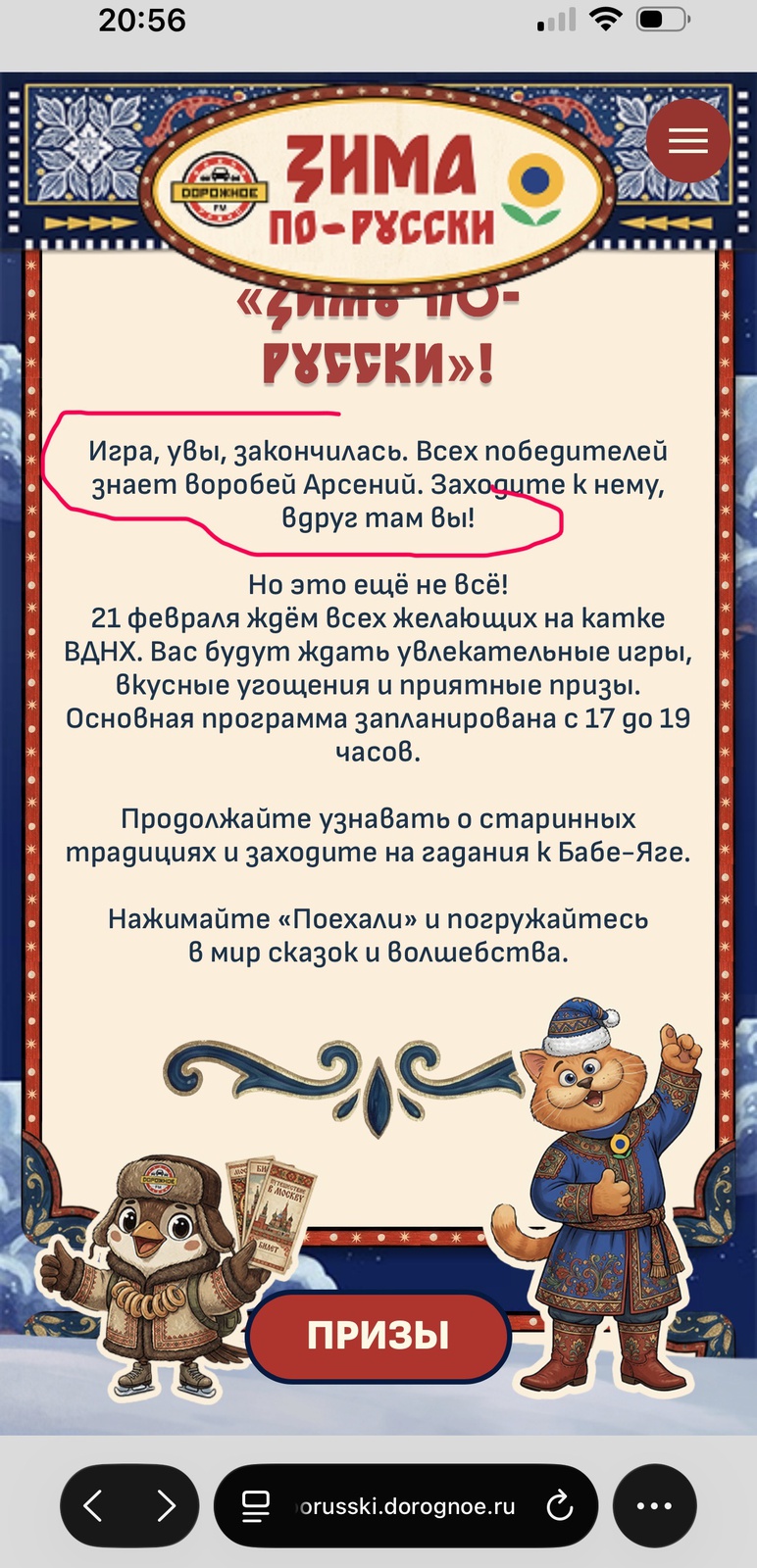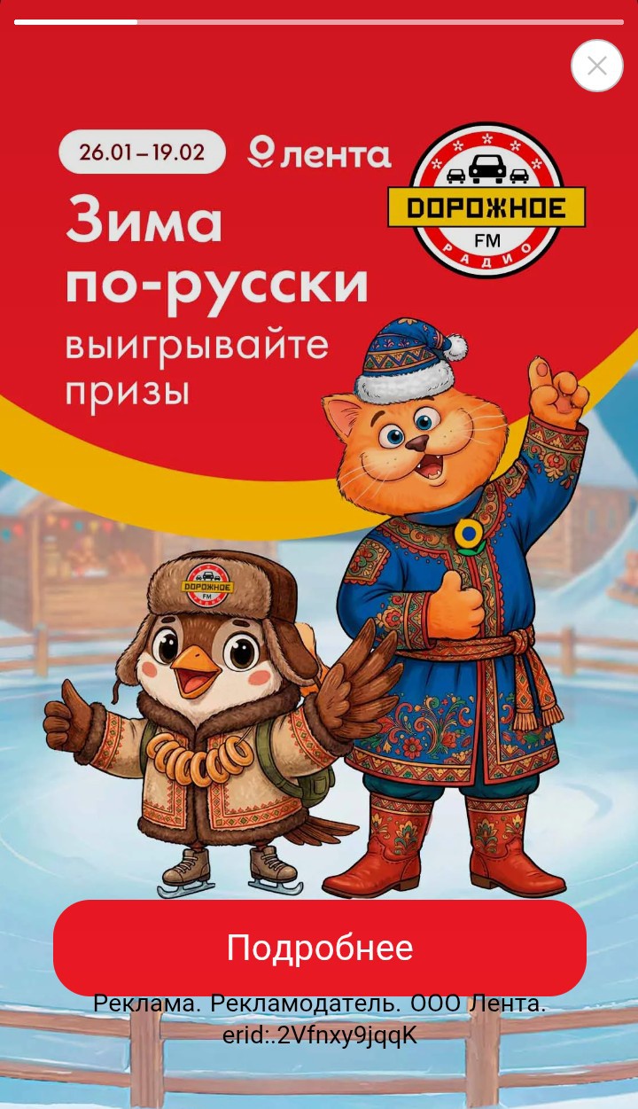 Зима станет теплее вместе с «Лентой» и Дорожным радио. Узнавайте о старинных традициях и заходите на гадания к Бабе-Яге. До 15 февраля выигрывайте 100 сертификатов по 4 000 рублей в «Ленту», главный приз - поездка в Москву на каток ВДНХ.