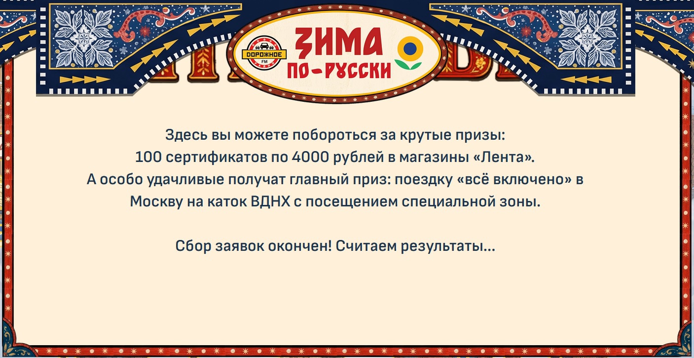 - 100 участников, чьи заявки окажутся самыми интересными и оригинальными по мнению редакции «Дорожного радио» становятся победителями и могут претендовать на Приз – электронный сертификат на 4 000 тысячи рублей в гипермаркеты «Лента»;