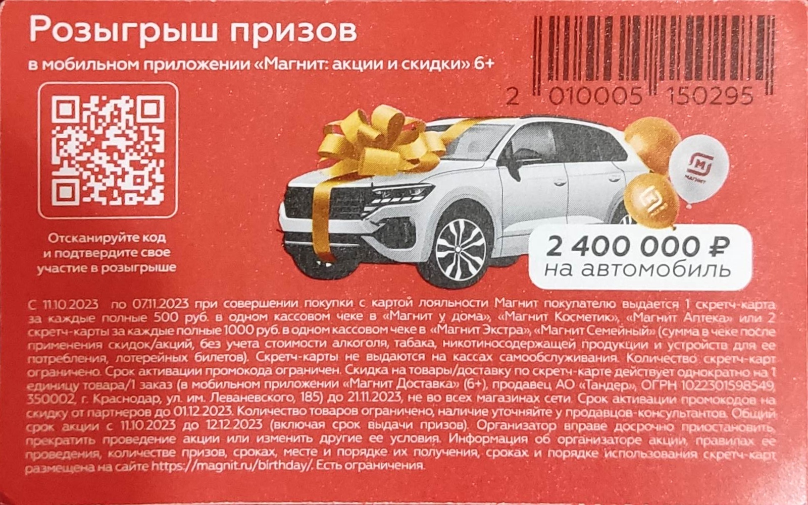 - Общий срок акции с 11.10.2023 до 12.12.2023 (включая срок выдачи призов);
