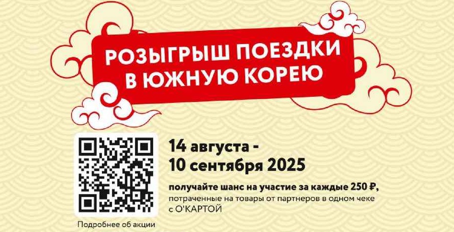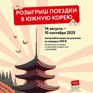 Участвуйте в акции в магазинах «Окей» и получите возможность выиграть поездку в Южную Корею. Получайте шанс на участие за каждые 250 руб., потраченные на товары от партнеров в одном чеке с О'Картой.