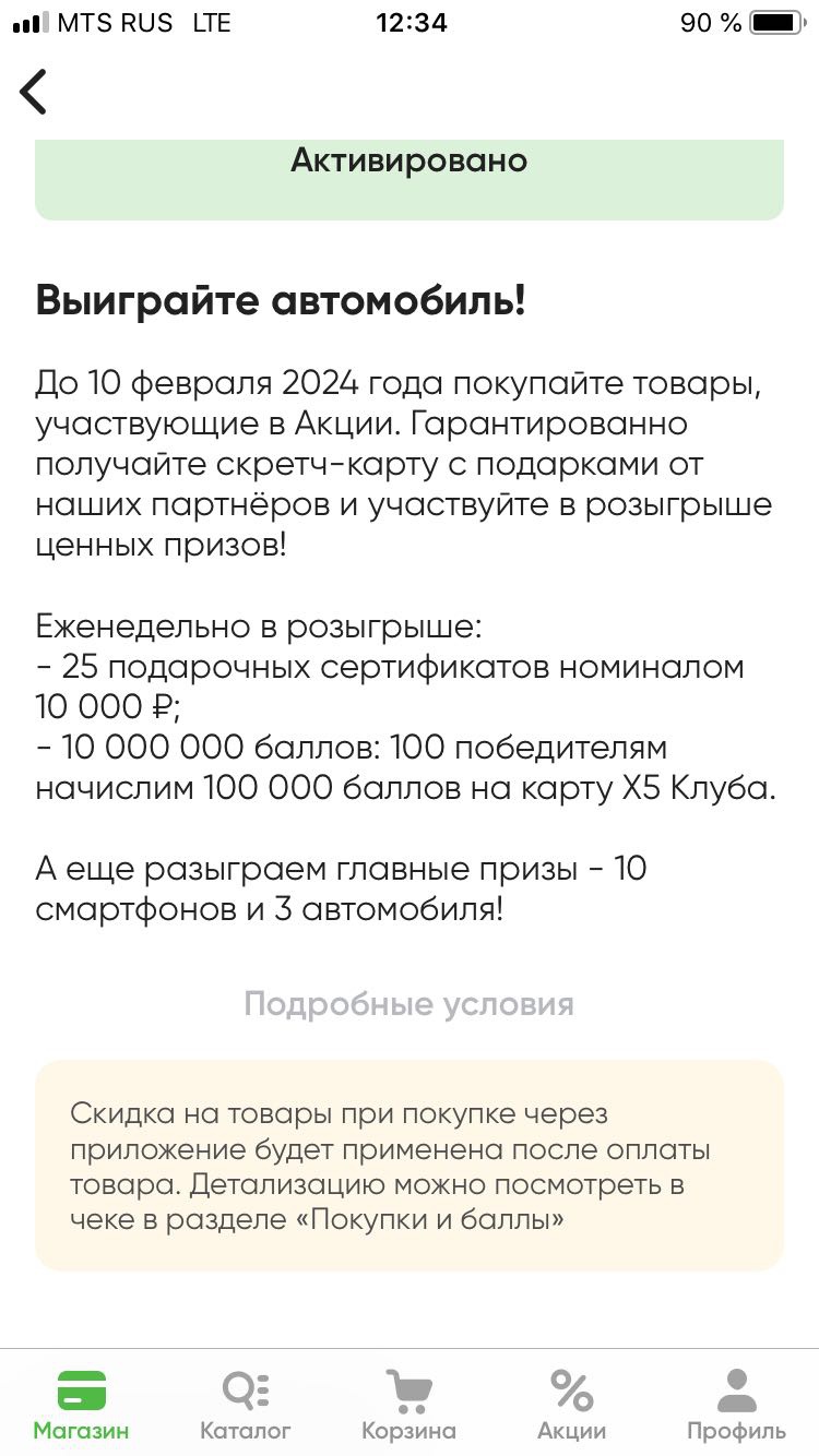 Активируйте персональное предложение в мобильном приложении Перекрёсток с 10.01.2024 по 10.02.2024. Купите от двух акционных товаров с картой Х5 Клуба и получите на кассе скретч-карту. Участвуйте в розыгрыше призов.