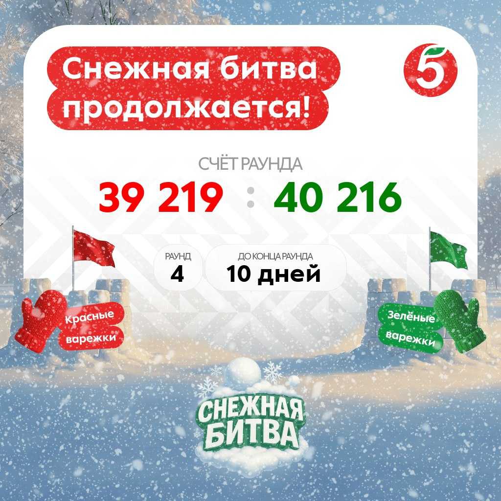 Снежная битва в «Пятёрочке»! Лепите и бросайте снежки в соперника, чтобы привести команду к победе. Заходите в игру каждый день, чтобы поучаствовать в розыгрыше робота-пылесоса Xiaomi S20 EU, игровой приставки Sony PlayStation Portal Remote Player и других классных призов.