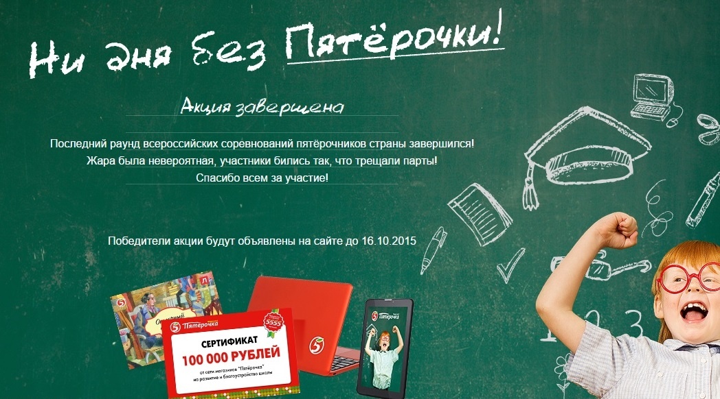 С 1 сентября 2015 года участвуйте в акции от магазина "Пятерочка". Всероссийское соревнование самых умных школьников от 0 до 99 лет. Проверьте свои знания и обменяйте их на призы!