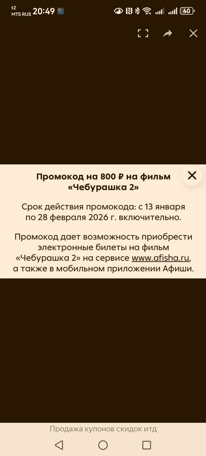 - Промокод на сумму 800 руб. на билеты в кино «Чебурашка 2»* - 25 монет;