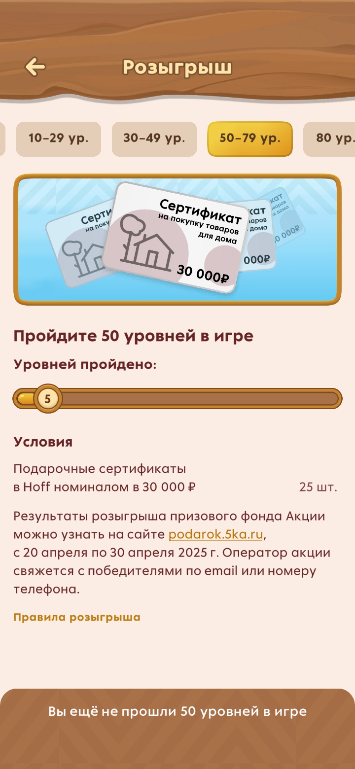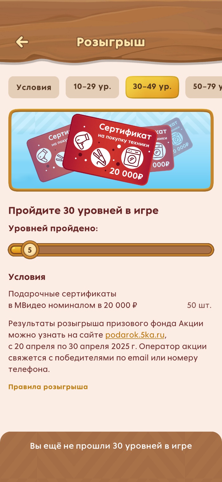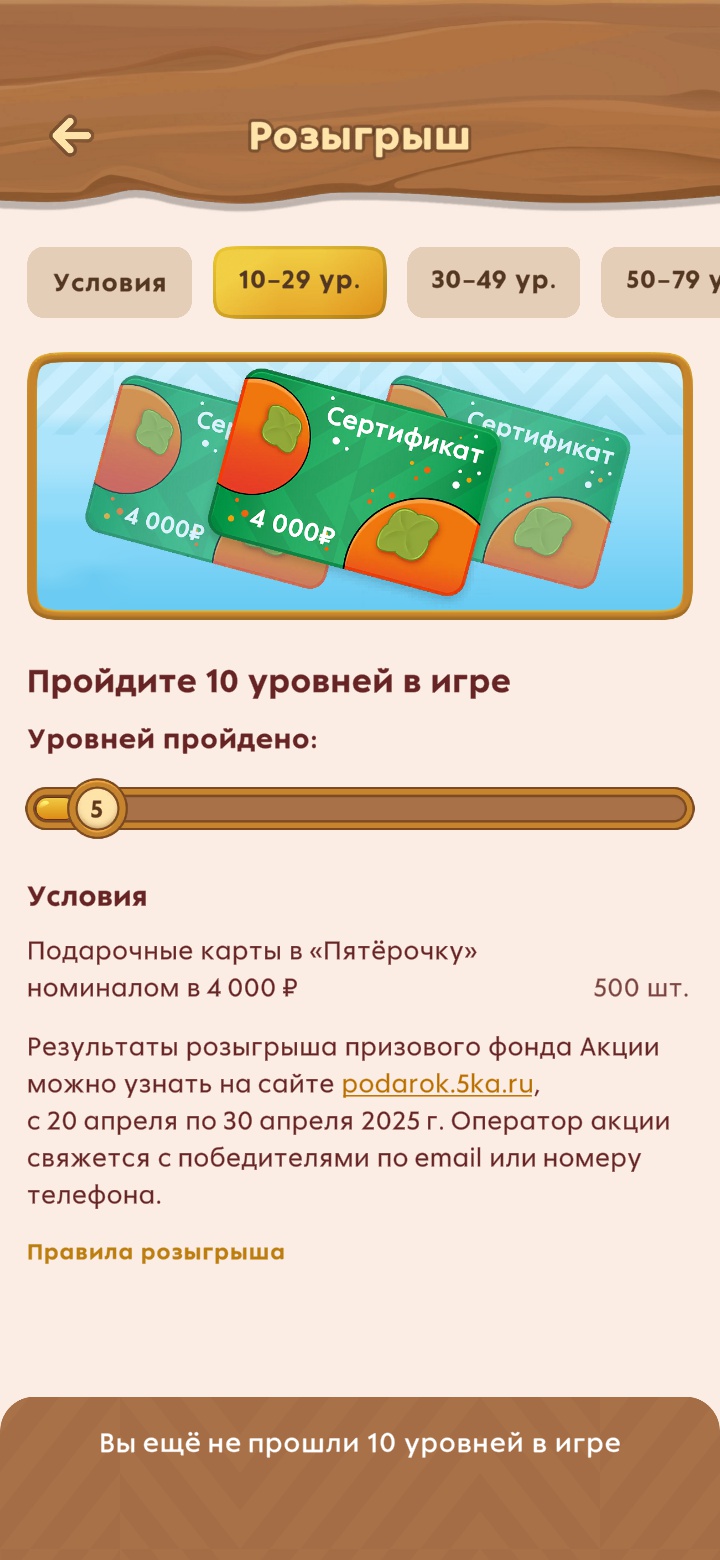 Играйте в приложении «Пятёрочка» и получайте гарантированные призы, участвуйте в розыгрыше сертификата на 100 000 рублей и других ценных подарков. 3 жизни бесплатно каждый день, а с подпиской Пакет — 4 жизни!