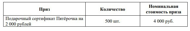 - Подарочная карта Пятерочка 2000 рублей - 500 шт.;