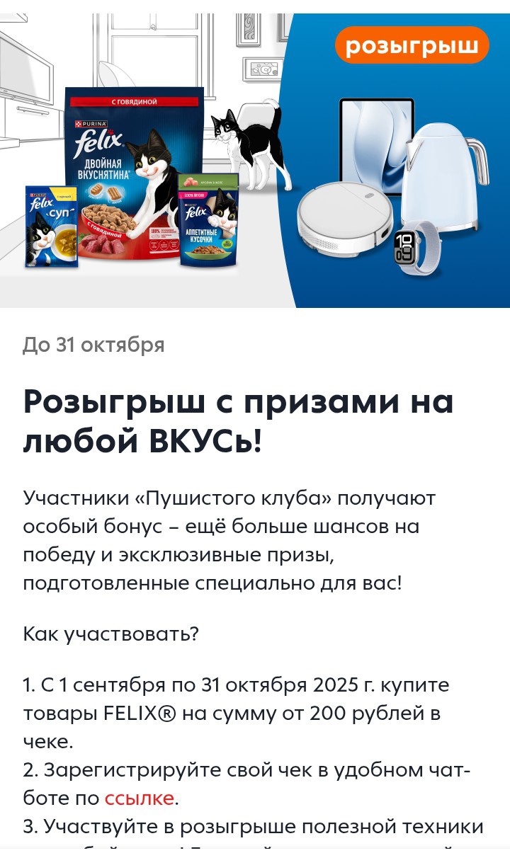 - Покупайте любую продукцию FELIX® на сумму от 200 руб. в чеке в магазинах «Пятерочка» с применением карты лояльности X5 Клуба;
