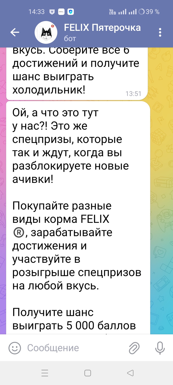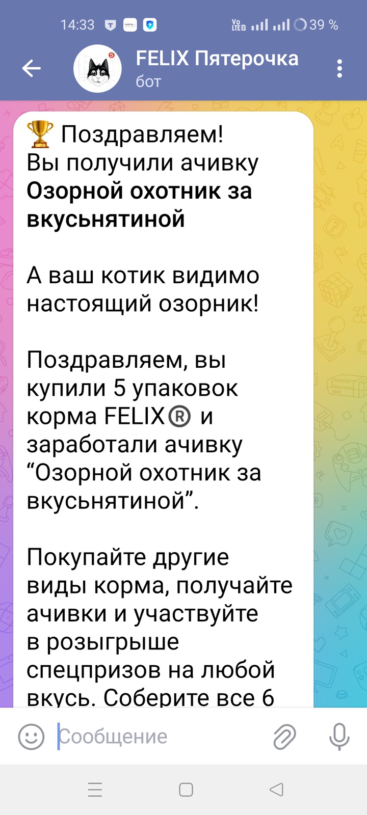 - Зарегистрируйте чек в мессенджере Телеграмм @FELIX_5ka_bot;