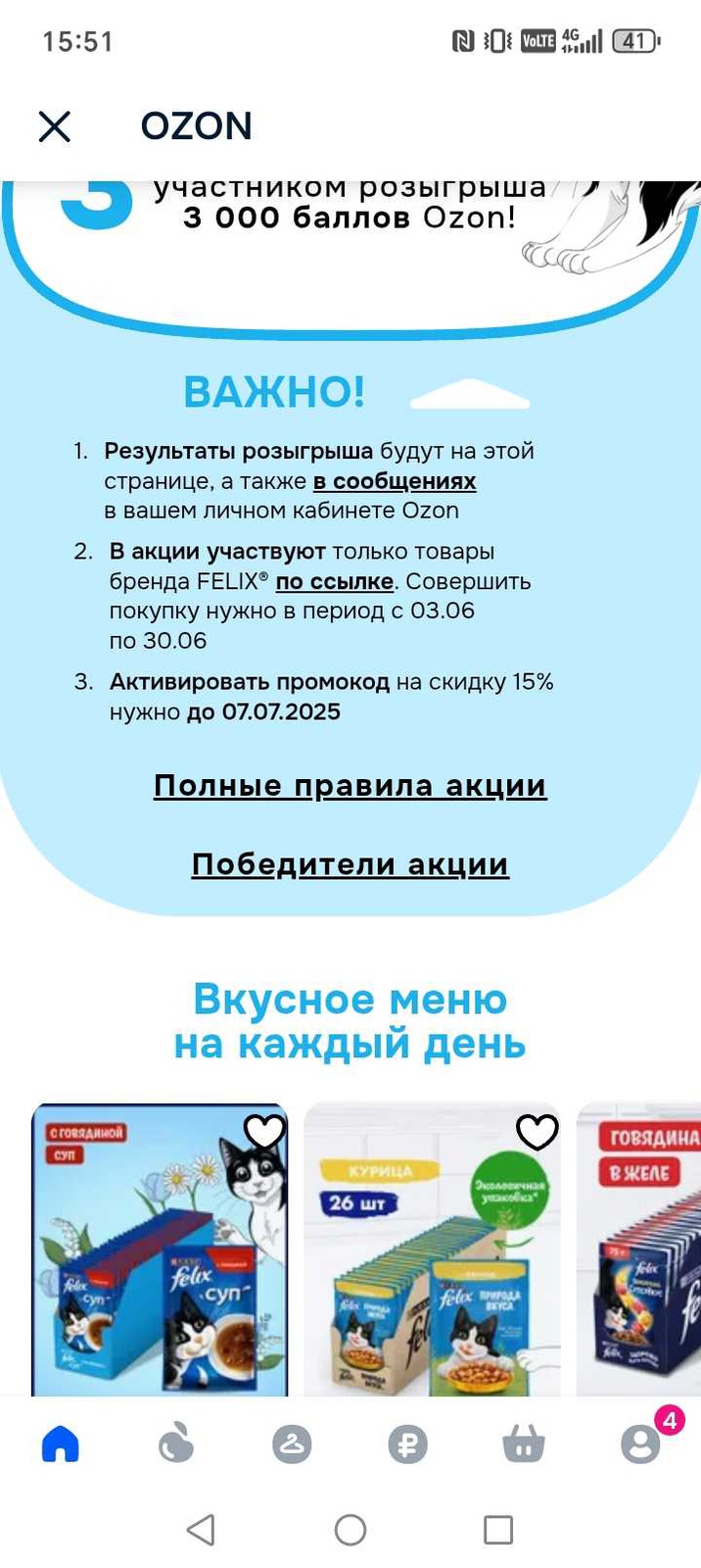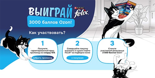 Совершайте покупку влажного и сухого корма FELIX® на Ozon из подборки и участвуйте в розыгрыше 3000 баллов.