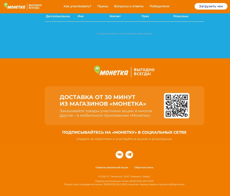 • Период совершения покупок Акционной продукции в магазинах ТС «Монетка» и регистрации чеков на Сайте: с 00 часов 00 мин 00 сек «29» сентября 2025 года по 23 час 59 мин 59 сек «06» ноября 2025 года по московскому времени включительно.