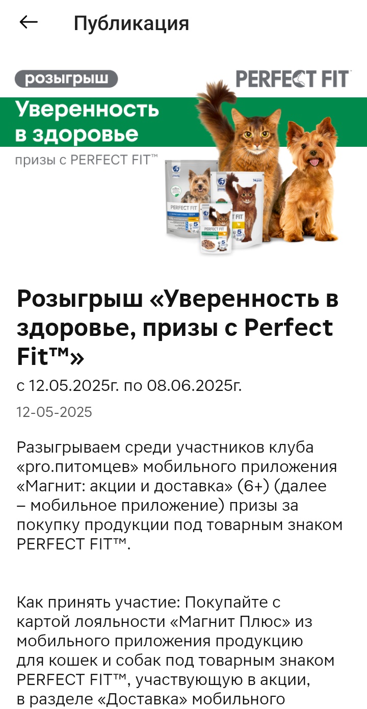 Уверенность в здоровье, призы с Perfect Fit. Разыгрыш среди участников клуба «pro.питомцев» мобильного приложения «Магнит: акции и доставка».