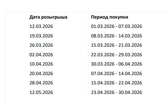 - Период совершения покупок для участия в акции: с 01.03.2026 г. по 30.04.2026 г
