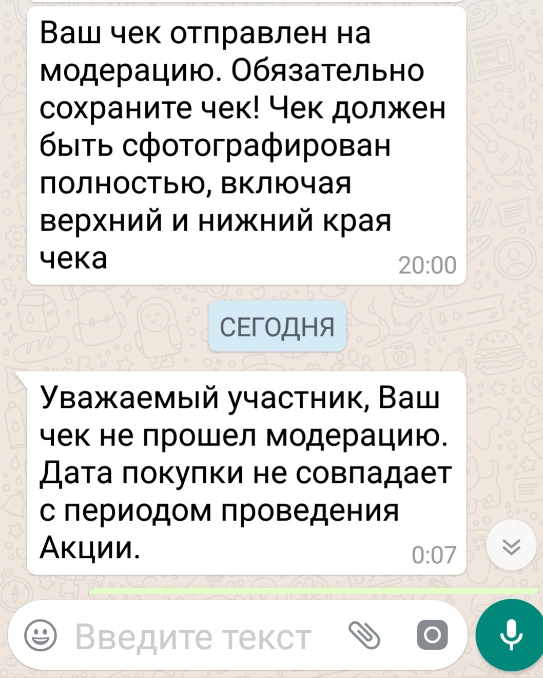 - Отправьте фото чека на номер 8 926 900 34 43 при помощи мессенджера WhatsApp;
