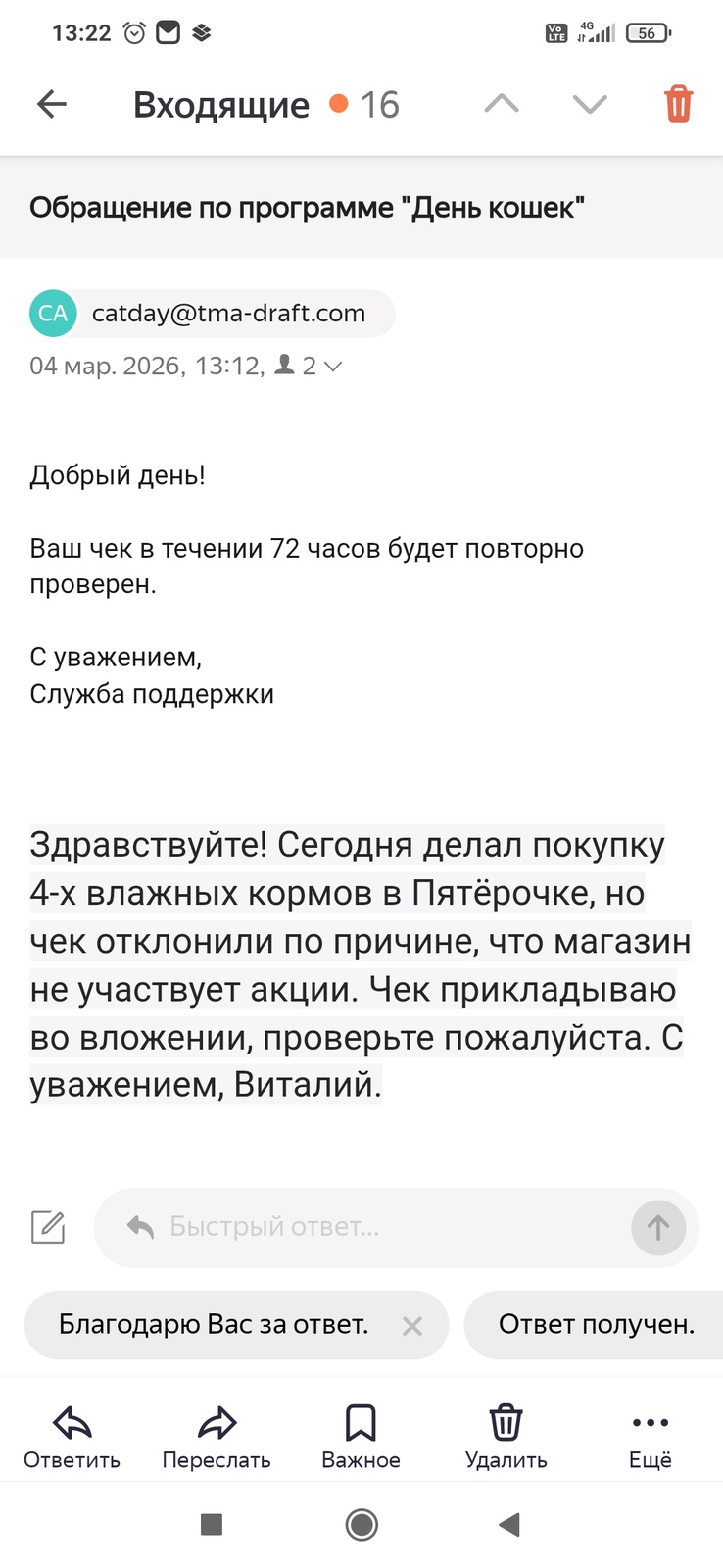 Ваш чек в течении 72 часов будет повторно проверен.
