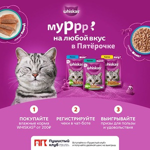 Покупайте влажные корма Whiskas® от 200 рублей в магазине «Пятёрочка» и мобильном приложении «Пятёрочка», загружайте чеки и воспользуйтесь шансом получить ценные призы!