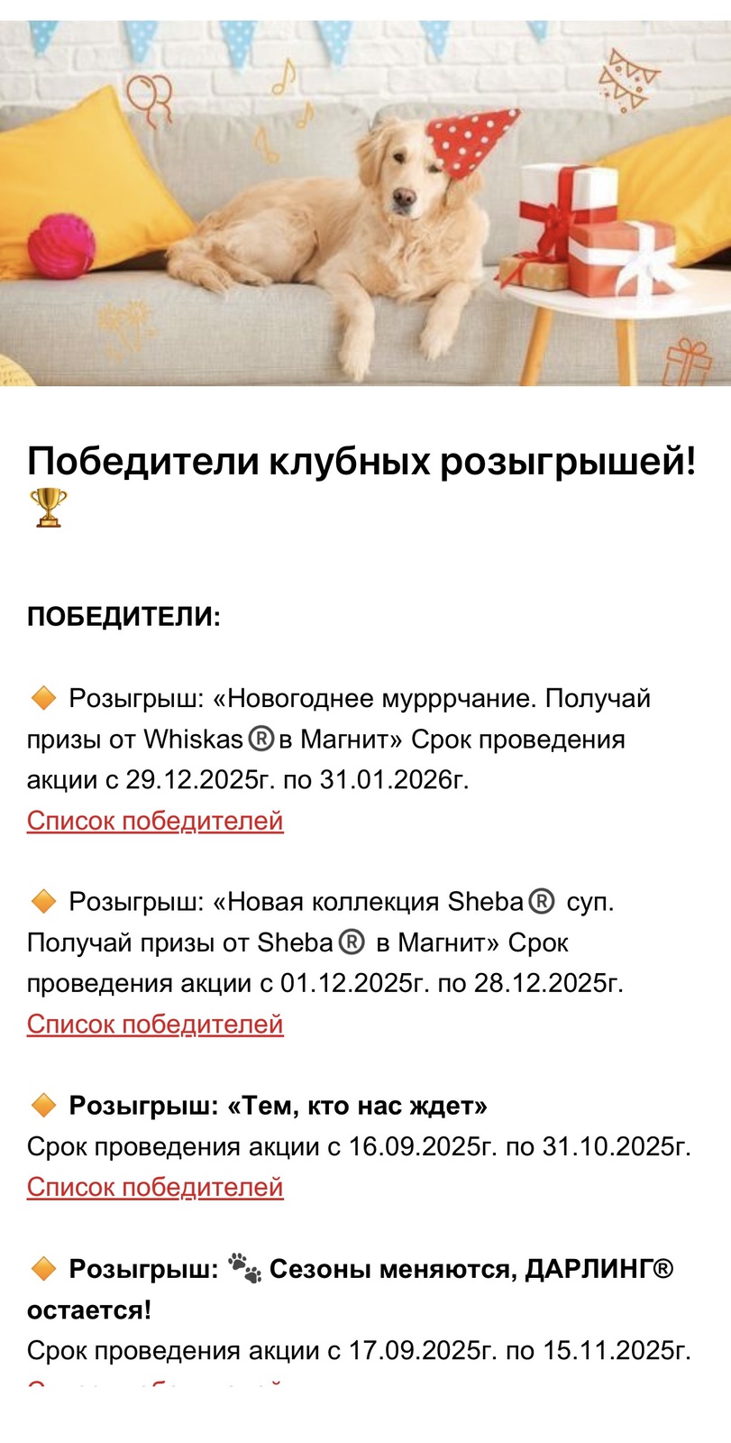 - Покупайте продукцию для кошек в магазинах торговой сети «Магнит»: форматы Магнит у дома, Магнит Косметик, Магнит Семейный, Магнит Экстра под товарными знаками WHISKAS®, участвующую в Акции, предъявив карту Магнит Плюс из мобильного приложения, также к участию принимаются чеки из раздела «Доставка» в период с 29 декабря 2025 г. по 31 января 2026 г. включительно. Получите шанс стать обладателем призов Акции!