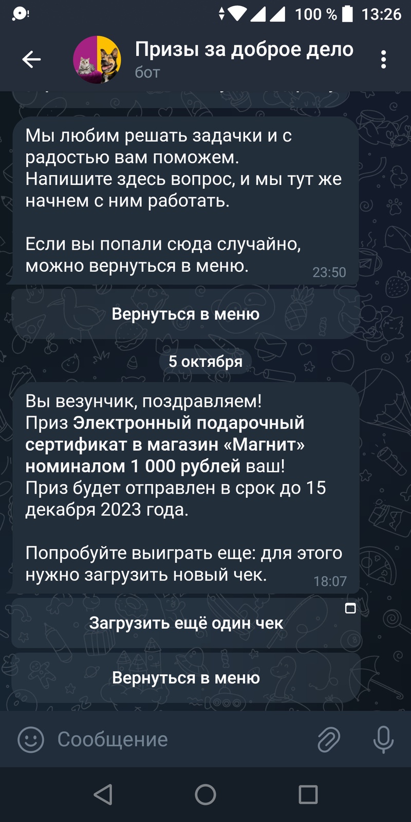 - Регистрируйте чеки в чат-боте - @prizy_za_dobroe_delo_bot;