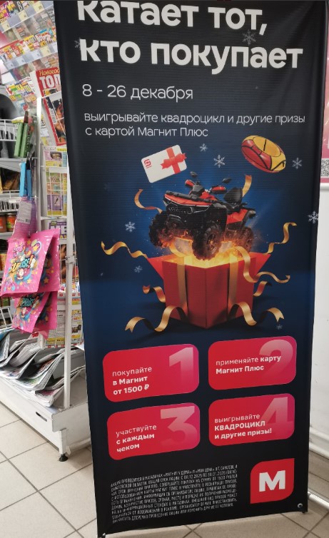 Было? новая акция в магните: при совершении покупок на сумму от 1500 рублей Среди призов - электронные сертификаты на сумму 4 000 рублей, тюбинги стоимостью до 5 000 рублей и главный приз — квадроцикл стоимостью до 250 000 рублей.