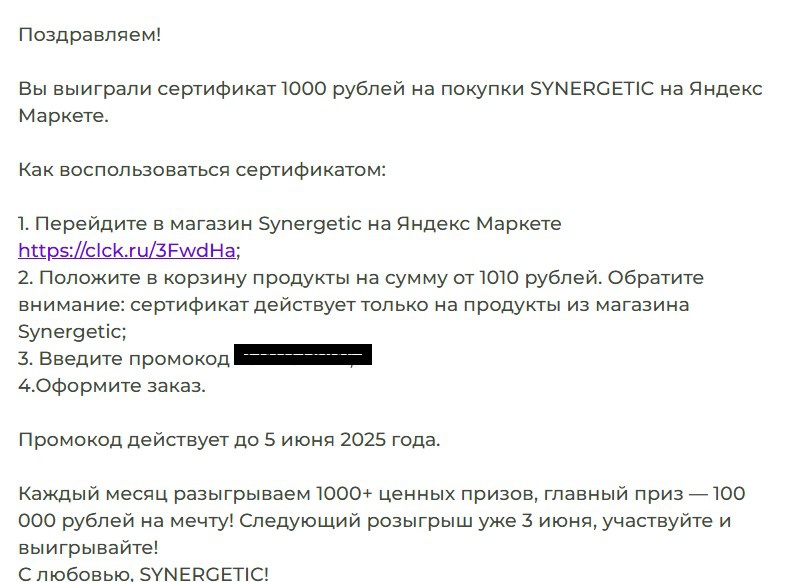 Приз акции Synergetic «Розыгрыш от SYNERGETIC - Май 2025»