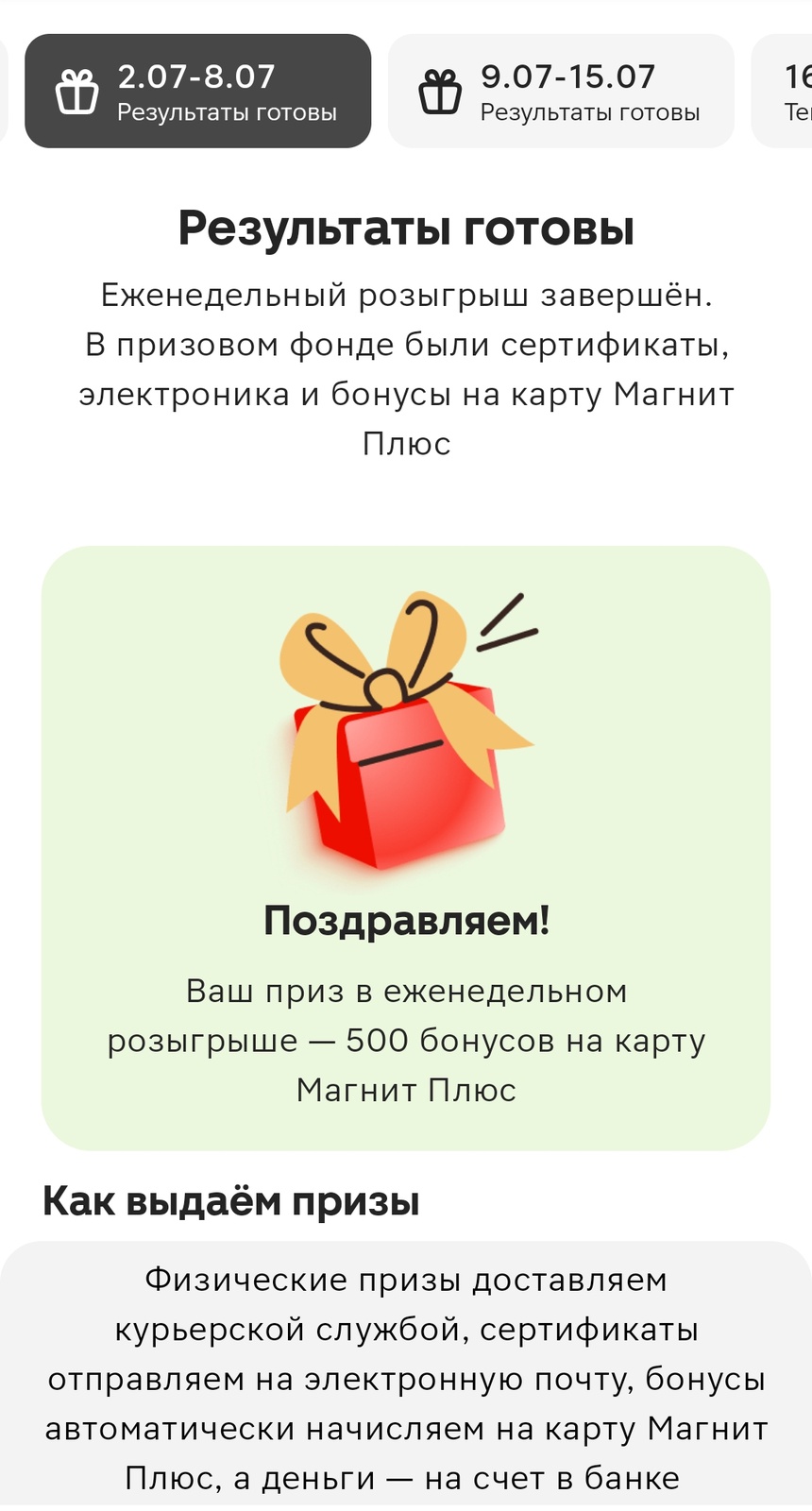 Призы / Лента призов / Dmitriy23 / 500 баллов на карту Магнит от Юбилейное