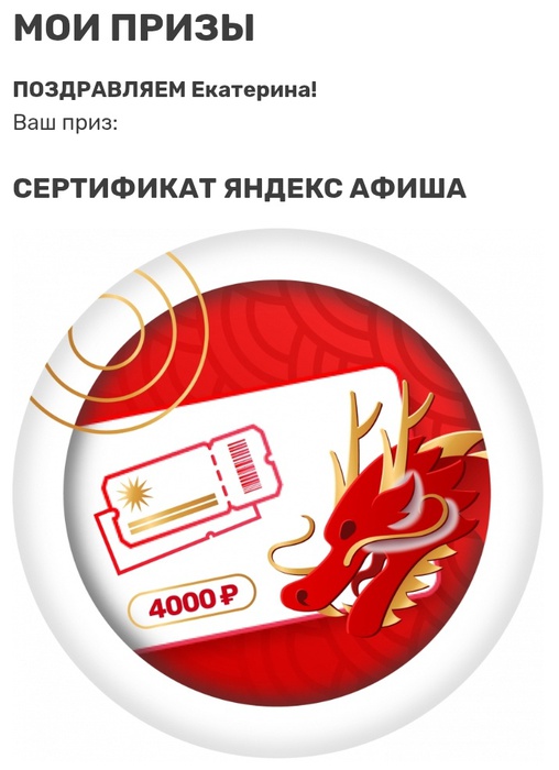 Призы / Лента призов / Ekaterina1509 / Яндекс афиша 4000р от Акция Добрый и Burn, Пятерочка «Продли праздники в Китае!»