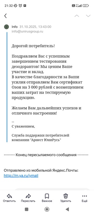 И снова здравствуйте! Призы давно не выкладываю, волшебных нет пока что. Этот приз для меня очень забавный))) Приходит приглашение на почту протестировать АКС от юнилевер. Со своей почты заполняю анкету на мужа и благополучно забываю об этом. Я на работе. Муж пишет в запрещенный мессенджер, мол позвонили и сказали-вы в тестировании участвуете? Почему чек не отправили? Муж знать не знал, что я заявку подала, почту пролистывает и особо не читает. Он говорит-да, участвую. Ему говорят-сегодня последний день отправки чека с покупки. Чек будет-да, направлю. Пишет мне, где чек? Говорю чека пока нет, но сейчас куплю товары. Через самокат тут же заказала товары и он отправил чек. Думала протестирует хороший дезодорант(а их 2 штуки тестировать надо было) и вернут стоимость около 800 рублей. Правил нигде не смогла найти, поэтому надеялась, что у супруга будет 2 бесплатных дезика. А после принятия чека-БИНГО, протестирует и получит сертификат на 3000 рублей. И конечно же ему эта суперская акция понравилась и он с удовольствием прошёл все этапы тестирования. Сегодня ему прислали сертификат в озон на 3000 рублей. Акция огонь, и купили и рыбку съели))