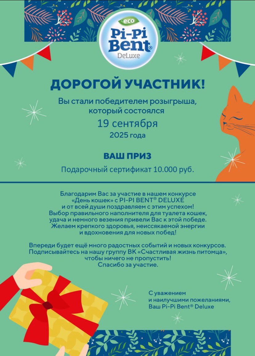 Призы / Лента призов / Kladoiskateli / Подарочный сертификат 10 000 руб. от Pi-Pi-Bent