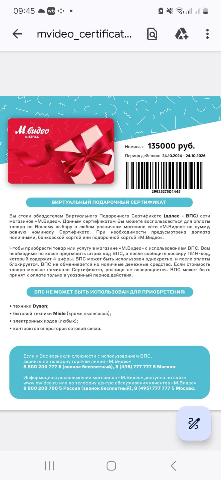Подарочная карта М.Видео, номиналом 135 000 руб. для покупки iPhone 15 pro от Акция Jaguar и Пятерочка: «Промо-активация Jaguar. За тобой не угнаться!»